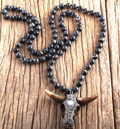 Black Bead Bull Skull Necklace