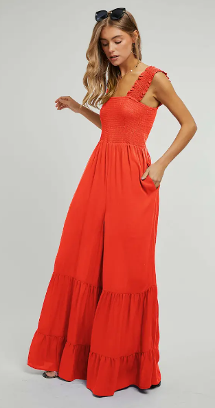 SMOCKED BODICE AND STRAP RUFFLE PANTS SELF TIE BELT JUMPSUIT WITH POCKETS.