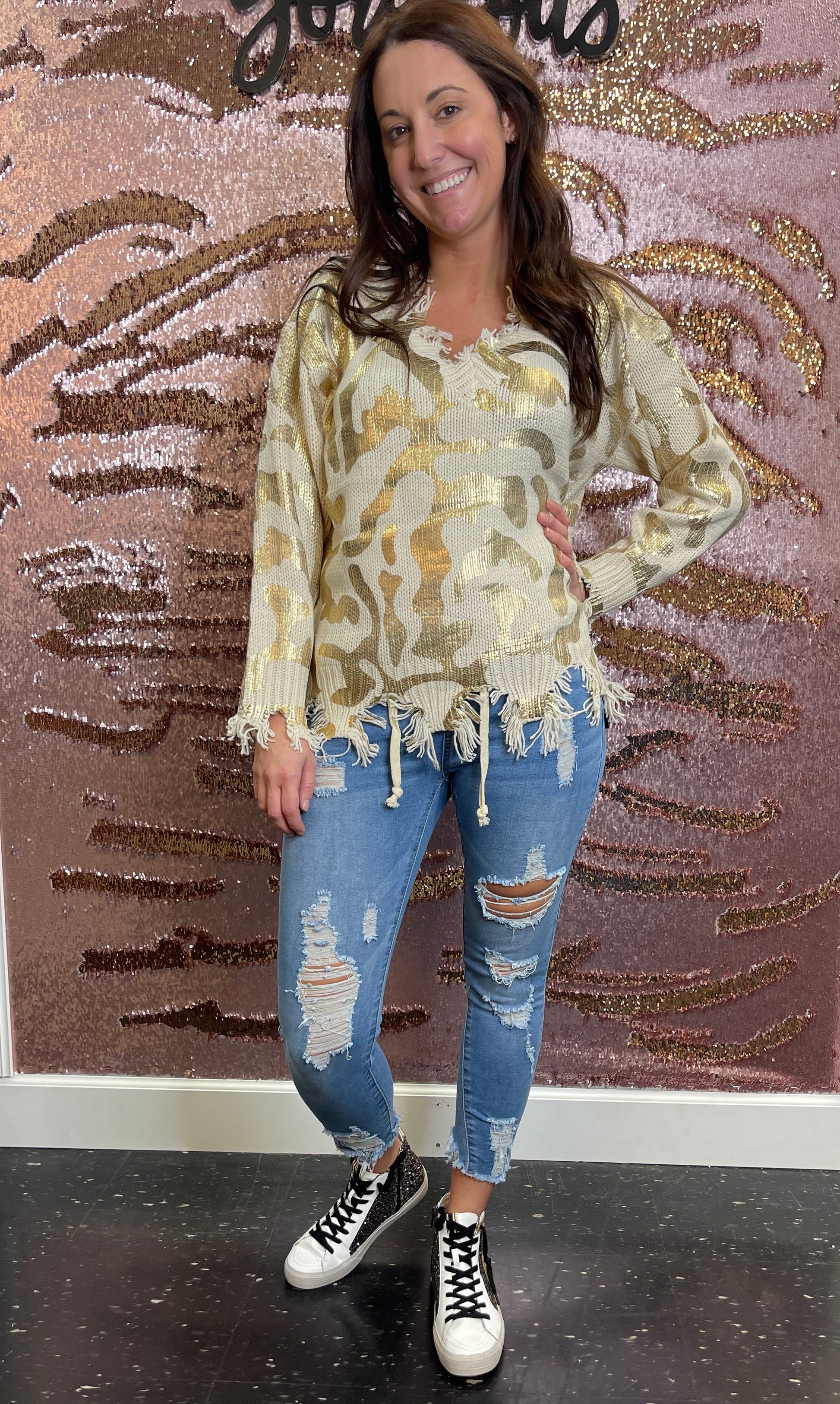 Take a walk on the wild side! This metallic gold cheetah distressed sweater brings out the instinct to cut loose. True to size.