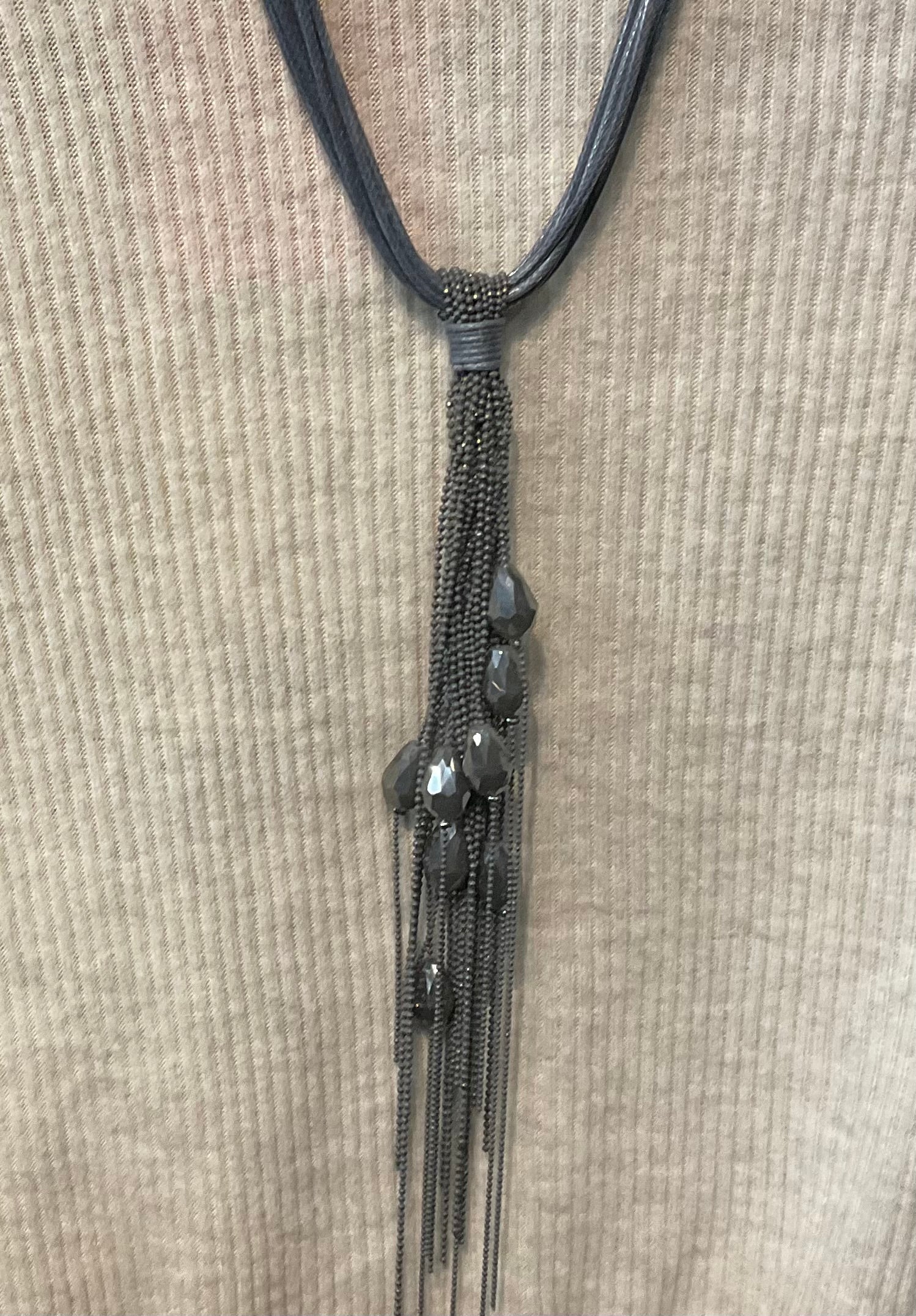 Multi dark gray leather like strands featuring dark gray , metallic, and black beaded drops and has matching earrings.