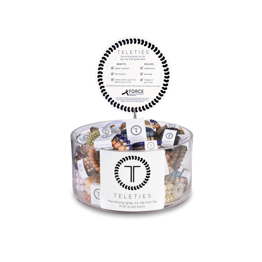 The hair tie gives back! With every purchase made, we give back to FORCE, an organization committed to improving the lives of people and families affected by hereditary breast, ovarian, and related cancers.